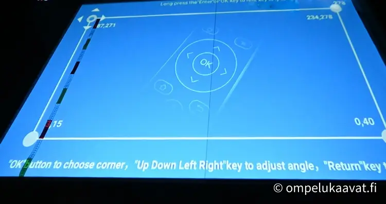 Seuraavaksi palaa projektorin asetuksiin ja käy muuttamassa yläreunan kulmapisteitä vaaka ja pystysuunnassa.