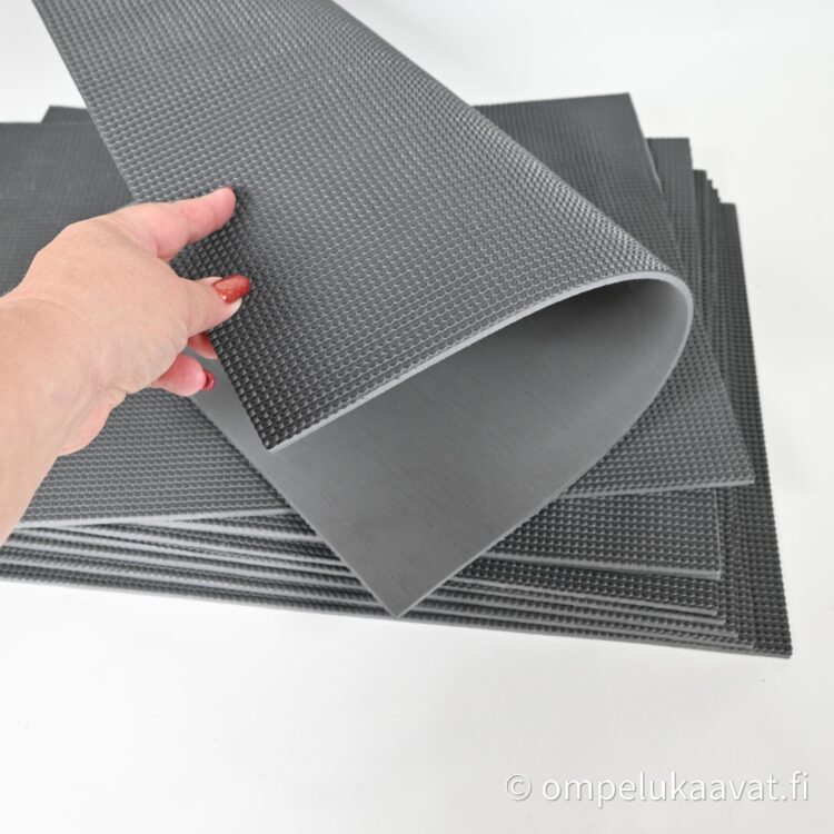 Tästä levystä voi leikata voimasaksilla, mattopuukolla tms. haluamansa kokoisia paloja. Käyrä mattopuukko on kätevä liimattua kengänpohjaa leikatessa.
