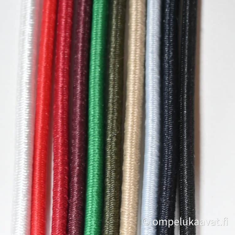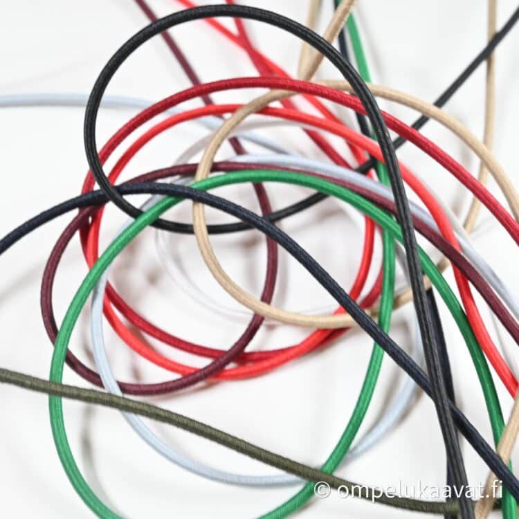 • Pyöreä kuminauha, jonka halkaisija on 3 mm, tämä on napakkaa ja laadukasta kuminauhaa. Jos tarvitset pehmeämpää valitse silloin 2 mm kuminauha