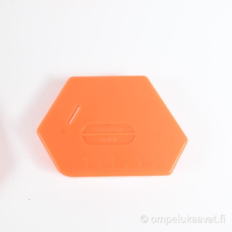 Magneetin reunan alle saa kankaanreunan ja näin kangas pysyy paremmin halutussa kohdassa. Magneetin pinnassa on mitta-asteikko.
