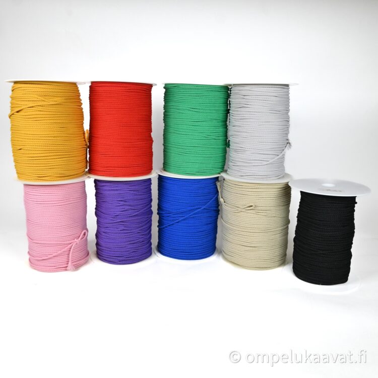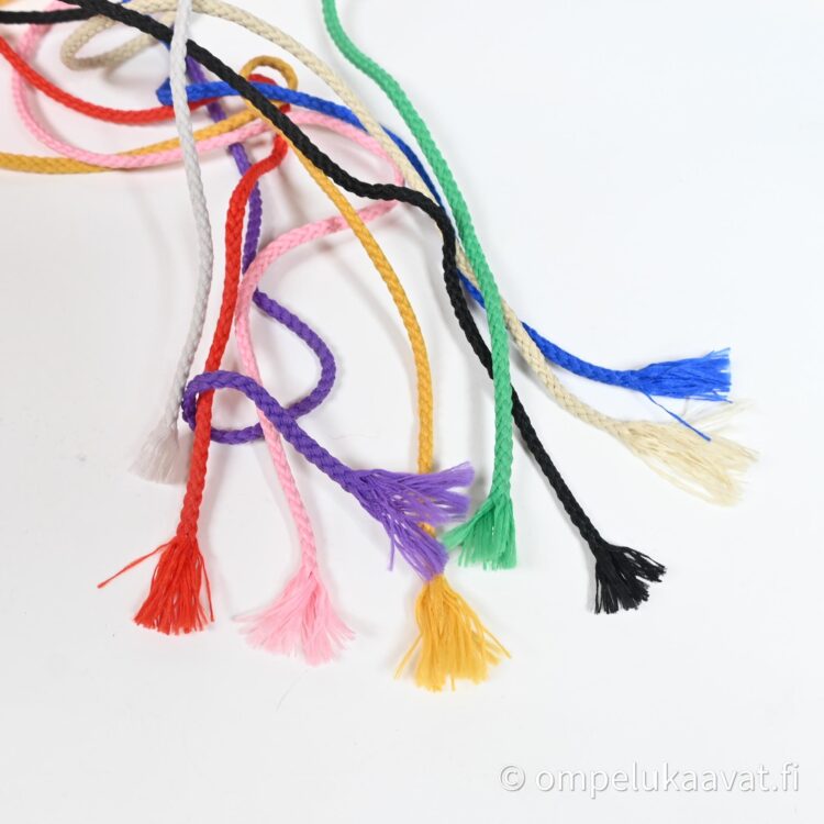 Kotimainen pyöreä punos 3 mm, sopii käytettäväksi punottuna lemmikkien pannoissa, kengännauhana, rannekoruina, ystävännauhoihin ja erilaisiin punontoihin, askarteluun ym.