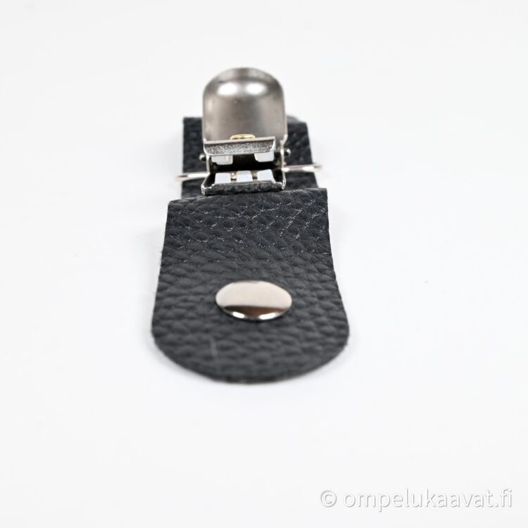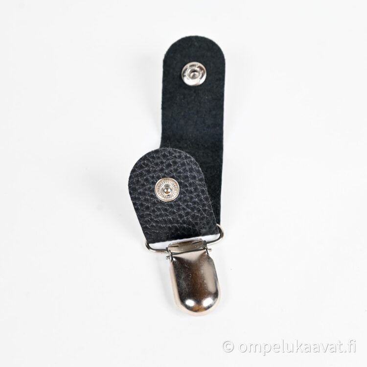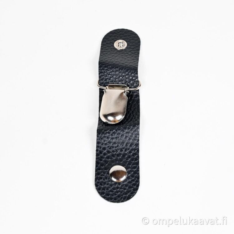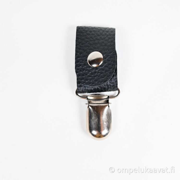 Malli 1, ripustin on keinonahkaa , keinonahkaan on pujoitettu henkselinsolki. Keinonahan koko on 2,5 cm x 12 cm