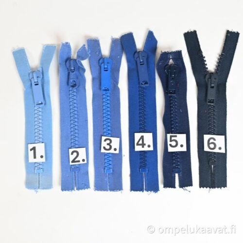 Etusivu / Tuotteet / Tarvikkeet / Vetoketjukauppa / Teollisuudenylijäämä vetoketjut / Teollisuudenylijäämä muovihammasvetoketjut siniset 14- 16 cm
